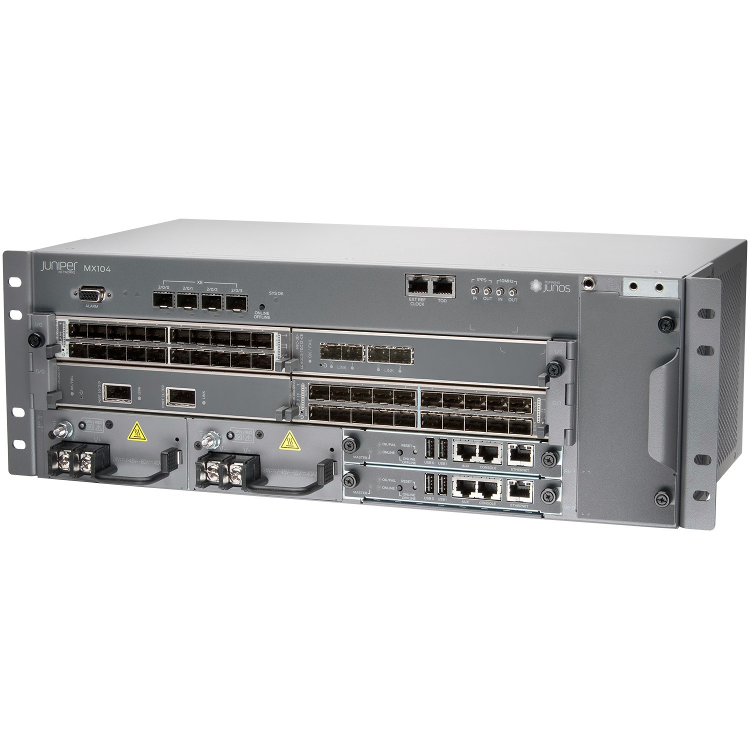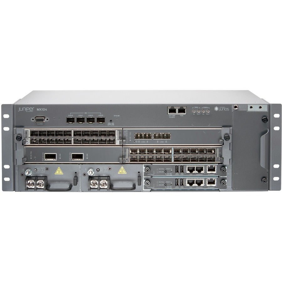 The SDN-ready MX104 3D Universal Edge Router is a modular, highly redundant, and full-featured MX Series platform built for space- and power-constrained service provider and enterprise facilities. The MX104 offers 80 Gbps of capacity, a redundant control plane for high availability, as well as four fixed 10GbE ports and four Modular Interface Card (MIC) slots for flexible network connectivity and virtualized network services. Optimized for mobile applications and central office deployments, the MX104 is also ETSI 300 compliant, environmentally hardened for deployment in outside cabinets and remote terminals, and supports advanced timing features.
